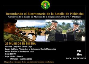 Por la gesta heroica realizaría varias actividades culturales y patrióticas; la Brigada de Pastaza ofrecerá un concierto por el Bicentenario de la Batalla de Pichincha.