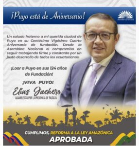 Un saludo fraterno a mi querida ciudad de Puyo en su Centésimo Vigésimo Cuarto Aniversario de fundación y desde la Asamblea Nacional el compromiso en seguir trabajando firme y constante por un justo desarrollo de todos los ecuatorianos.