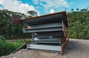 Al momento se concluyó la construcción de los estribos, y se fabrican las vigas que servirán para el montaje de los perfiles estructurales y el encofrado de la mesa del puente.