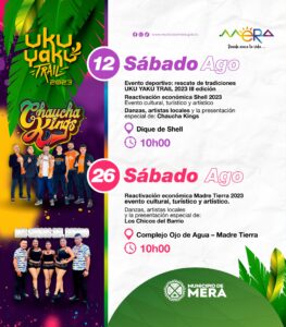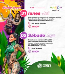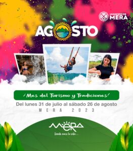 Vive el mes del Turismo y la Cultura en Mera. Te presentamos las actividades que tendra este hermoso cantón. Navegación de entradas Entregan más de USD 41 millones del Fondo Común para la ejecución de 21 proyectos en toda la Amazonía. Agenda de André Granda para el 31 de julio del 2023