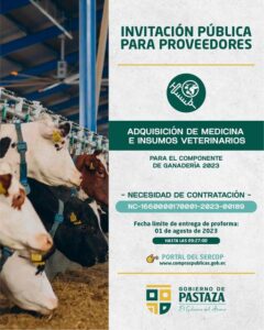 Participa a través del SERCOP. Objeto de compra: ADQUISICIÓN DE MEDICINA E INSUMOS VETERINARIOS PARA EL COMPONENTE DE GANADERÍA 2023 Ingresa aquí https://www.compraspublicas.gob.ec/ProcesoContratacion/compras/NCO/NCORegistroDetalle.cpe?&id=UvLjhQBXasqHp4nLX8pRe9Z_3qnR1e8cK3QCEJyvclw,&op=1 Fecha límite para la entrega de Proformas: martes, 01 de agosto hasta las 09:27 #ElGobiernoDelÁnimo Navegación de entradas ¡Los encuentros comunitarios tienen resultados! Pastaza lo tiene todo