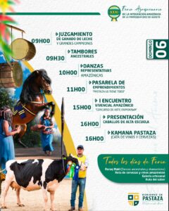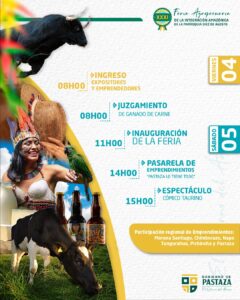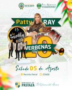 2๏ธโฃ Sรกbado 5 ๐ Inauguraciรณn de la Feria 10 de Agosto, donde podrรกs encontrar increรญbles emprendimientos de Pastaza, asรญ como los mejores ejemplares de ganado ๐ ovino y bovino. En la noche disfruta de las verbenas con la presentaciรณn de Patty Ray y a bailar con La Bandita.