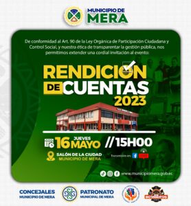 En cumplimiento a la Ley Orgánica de Participación Ciudadana y Control Social y en obligación ética de trasparencia para con ustedes los mandantes, nos permitimos extender una cordial invitación a la Deliberación Pública del Informe de Rendición de Cuentas del Gobierno Autónomo Descentralizado Municipal del Cantón Mera, del año fiscal 2023.