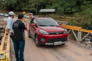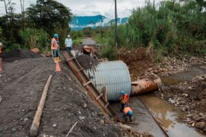 Puente provisional sobre el río Tigre, anunciando la próxima construcción de un nuevo puente de hormigón de dos carriles, apto para todo tipo de vehículos.