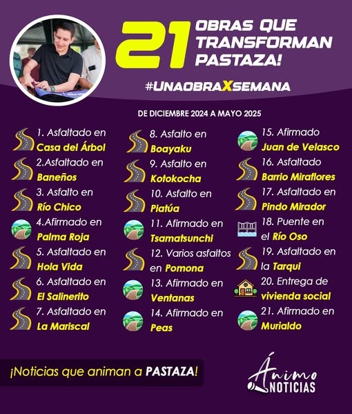Entre diciembre de 2024 y mayo de 2025, se han entregado 21 obras en todo el territorio provincial: asfaltados, afirmados, vivienda social y un nuevo puente, mejorando la conectividad, seguridad y calidad de vida de cientos de familias. Y esto recién empieza.