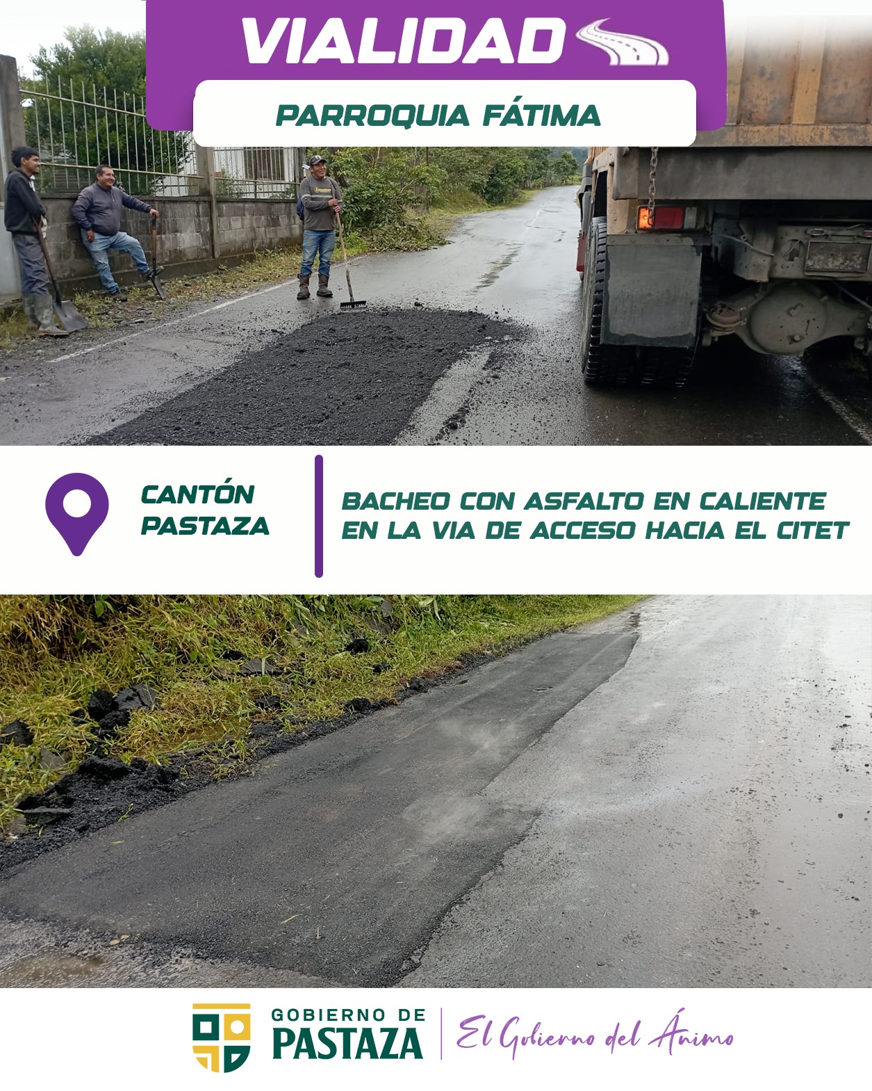 El Gobierno de Pastaza concluyó los trabajos de bacheo con asfalto en caliente en la vía de acceso al CITET, parroquia Fátima, garantizando una mejor conectividad y seguridad para quienes transitan diariamente por este importante sector. 🛣️