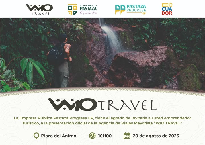 Bajo la visiรณn del prefecto Andrรฉ Granda, el Gobierno de Pastaza y la Empresa Pรบblica Pastaza Progresa EP, nace WIO TRAVEL, la primera agencia mayorista que conectarรก a los viajeros con la riqueza natural, cultural y espiritual de nuestro territorio.