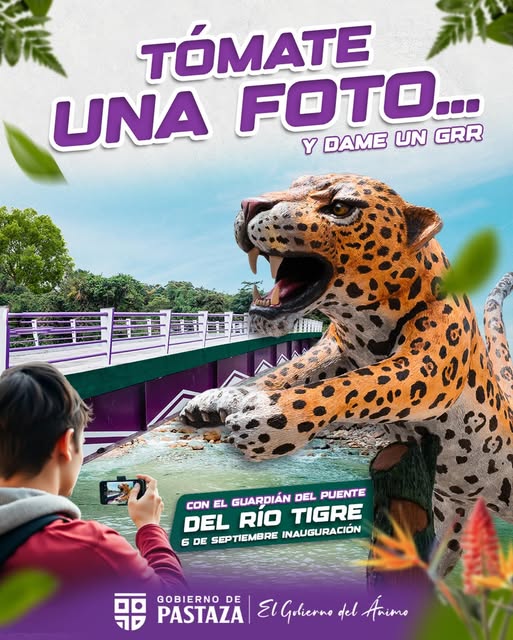 De 4 m de alto y 6 m de largo, un imponente jaguar de mirada fuerte y pelaje dorado custodia el nuevo Puente sobre el Río Tigre en Mera, recordándonos la fuerza de la naturaleza y la riqueza de nuestros bosques.