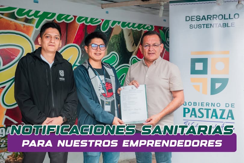 El Gobierno de Pastaza, liderado por el Prefecto Mgs. André Granda, junto al Arq. Patricio García, Director de Desarrollo Sustentable, entregaron notificaciones sanitarias a nuestros emprendedores locales: