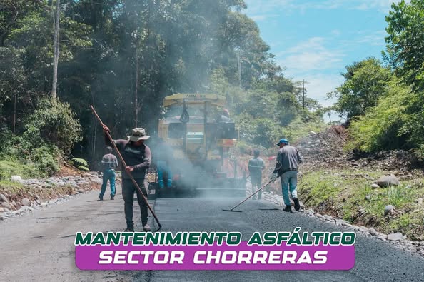 En la parroquia Veracruz, se ejecutan los trabajos de mantenimiento asfáltico en la vía Chorreras ( Gringoyaku), una obra por administración directa que contempla 2 kilómetros de mejoramiento vial.