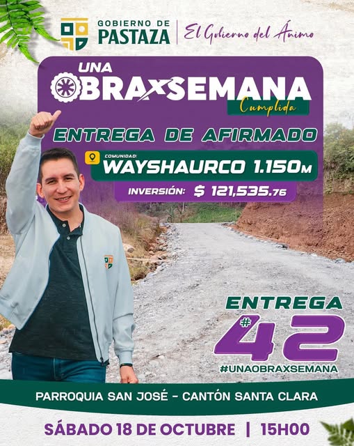 Pastaza no se detiene Navegaciรณn de entradas Trabajo cumplido en Arajuno. ENTREGA DE AFIRMADO WAYSHAURCO / OBRA POR SEMANA NรMERO 42