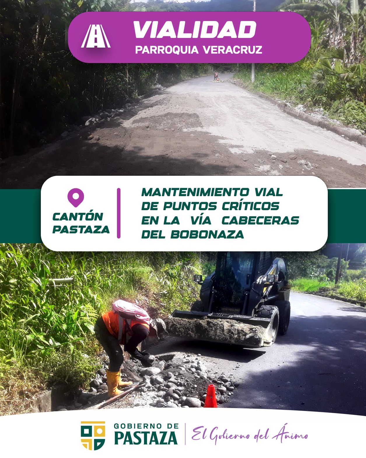 El Gobierno de Pastaza, bajo la administración del Prefecto André Granda, ejecuta el Proyecto de Mantenimiento Vial de puntos críticos en la vía Cabeceras del Bobonaza, mediante Administración Directa.